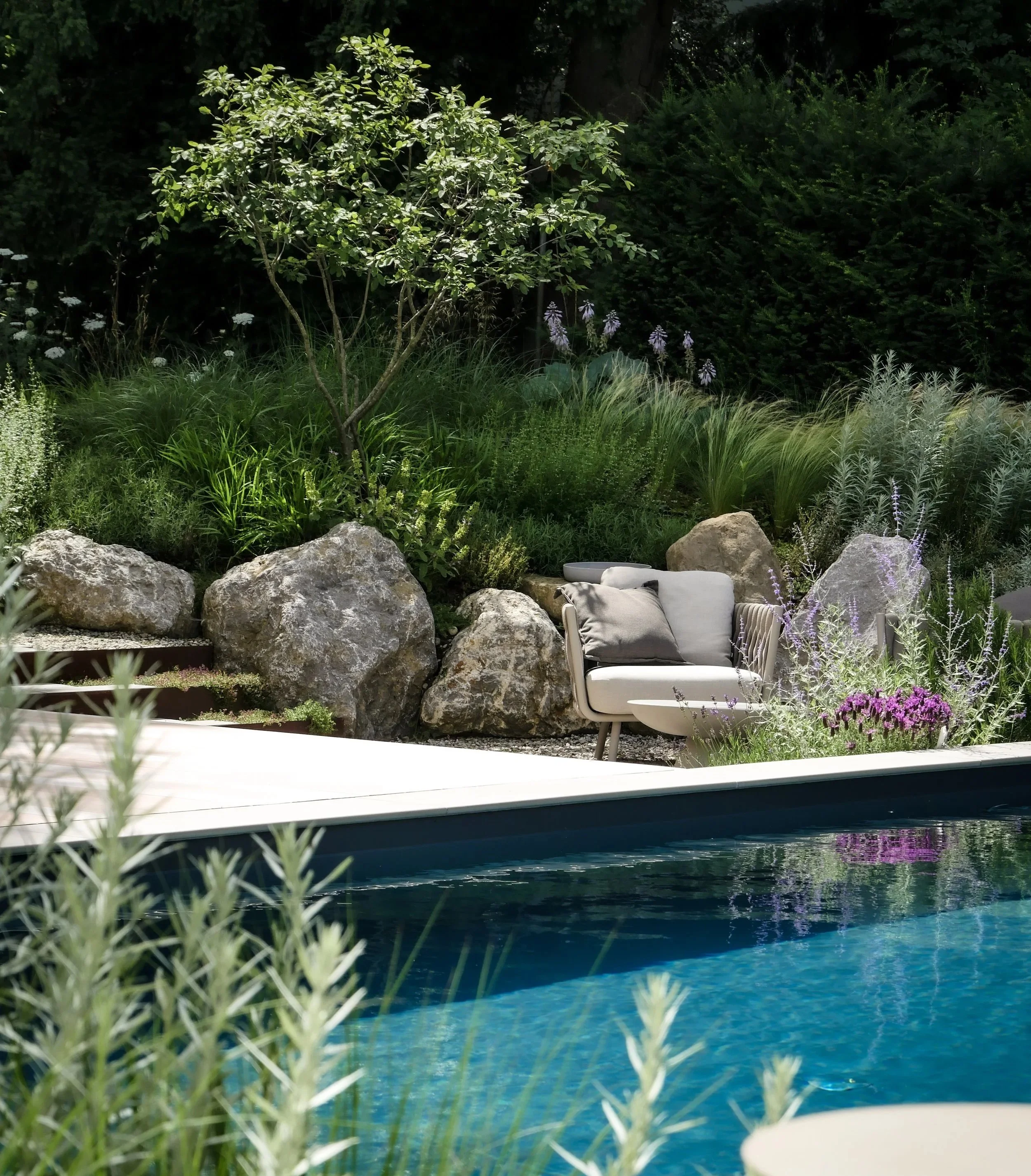Die Gestaltung dieses Gartens greift den modernen Charakter des Wohnhauses auf und vereint klare Linien mit einer natürlichen Vegetation. Der schmale Pool bildet die zentrale Achse des Gartens und spiegelt die asymmetrische Architektur des Hauses wider.